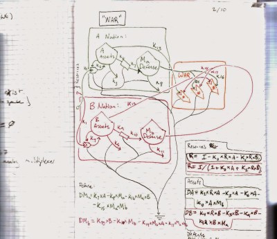 And he has scribbled some equations out to the side that model that violent ecology. We can’t see how he defines the terms in the equations, because we don’t see the rest of his notes, but you get the idea. He is modeling war mathematically, energetically.