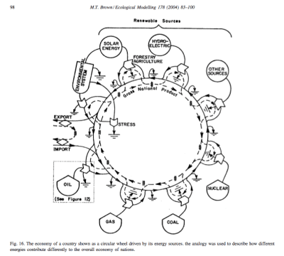 Here you see the energetic inputs to the national economy from oil, gas, coal, hydroelectric, solar and nuclear power, and inputs from the forestry and agricultural sectors. He also depicts the input and output from imports and exports, as well as the environmental system, and interrelates the whole in a circular fashion, denoting the largely closed character of the system, as it mostly is on a small planet like the Earth.