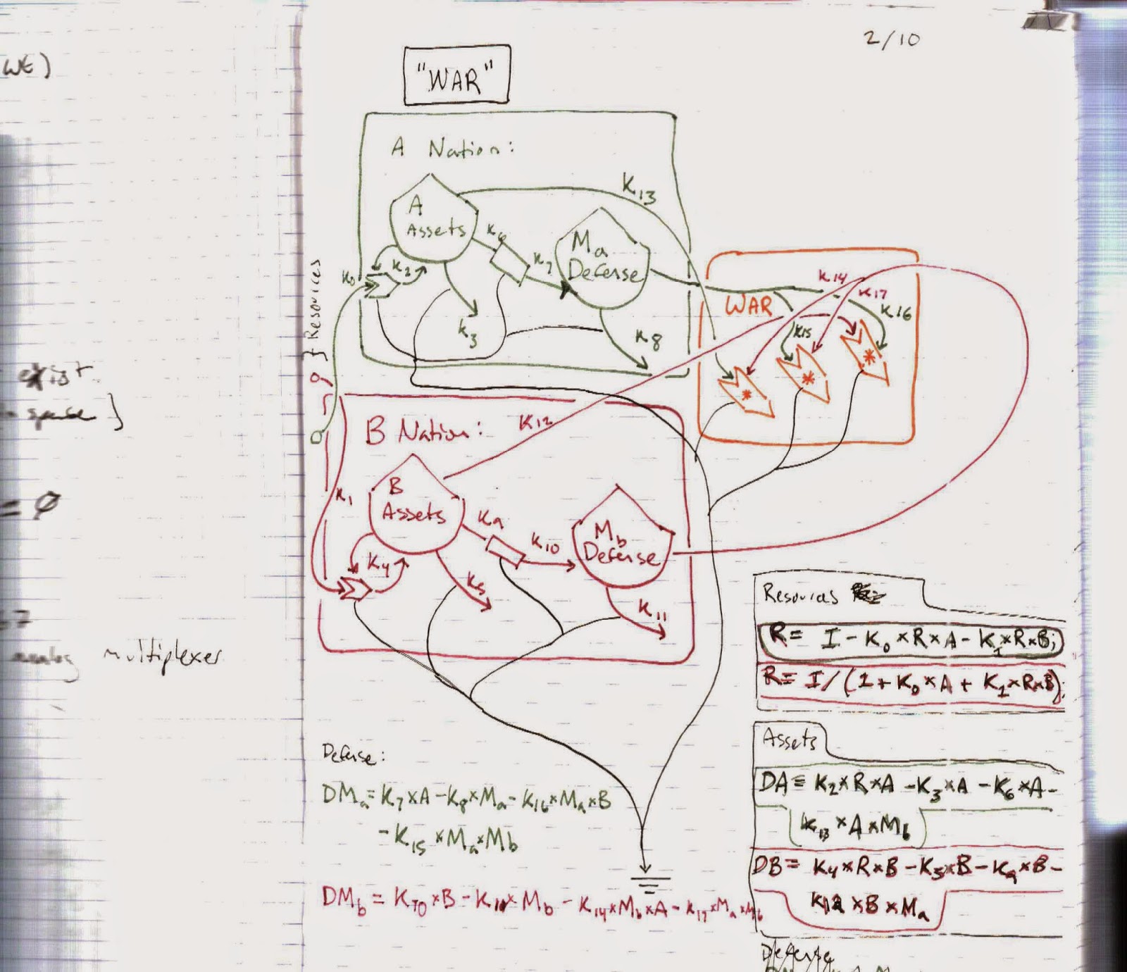 Here’s an example of what I am talking about. It’s a sketch from one of Odum’s own notebooks. He is modeling the ecology of war, if you will, between two nations, their assets, their resources, the interplay between those factors.