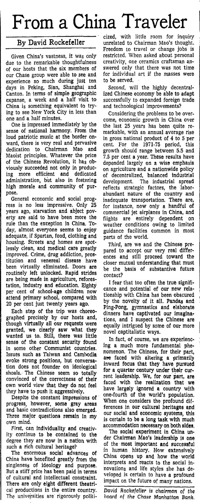And as disgusting as that was, of course another very famous or what should be very infamous example of a influential Western figure backing that disgusting display that we saw, under the reign of Mao was of course the 1973 New York Times editorial by none other than David Rockefeller, under the title ‘From a China Traveler’ in which I think he infamously said: