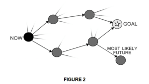 …So how does this fit within with the four-dimensional model described earlier? … In Figure 2, I use circles to represent choice points and arrows to indicate possible futures that emanate from them. Let’s say that you are currently at NOW. The circle labeled GOAL is a future that you’d like to reach—say, one in which you have a new job. The circle labeled MOST LIKELY FUTURE is the most likely or probable outcome—the one in which you stay at your current job. As the diagram illustrates, you can reach your goal in at least two ways—either by choosing or creating a new path right now (branching upward immediately), or by doing so a little later on. For instance, right NOW, you might decide to quit your job. Or you might create an improbable future—through creation—where a freak accident or illness ultimately leads to you being laid off. By using active consciousness to enable new choices to appear and to help you make the correct choices over time, you may find that you are ultimately led to your goal of a new and better job.