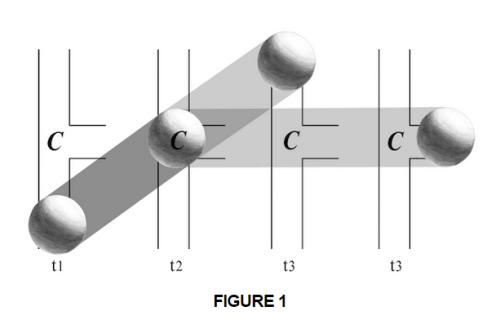 Let’s begin to consider this mind-bending idea by simply imagining a single point of branching. Consider the world of a three-dimensional ball, depicted in Figure 1. The ball begins, at time t1, at the bottom of a road. When it arrives at point C (which occurs at time t2), the ball must make a choice. Does it move along the branch moving to the right, or does it continue moving upward? In one future reality, the ball has moved up at time t3. In another future reality, it has branched to the right at t3, creating a fork in four-dimensional space.