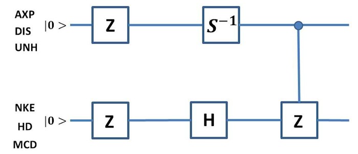 Selecting a stock portfolio, from the shares of companies listed on Dow Jones Industrial Average market index, composed of McDonald’s Corp. (MCD), The Walt Disney Company (DIS), American Express Company (AXP), and United Health Group Incorporated (UNH),an astonishing chain of quantum gates is recovered. Hadamard gate, Pauli gates and S-phase gate are all acting concerted in 1-qubit quantum circuit.
