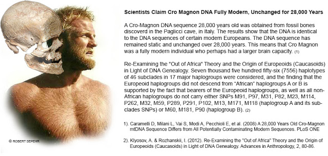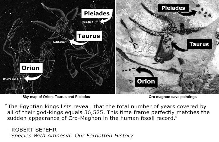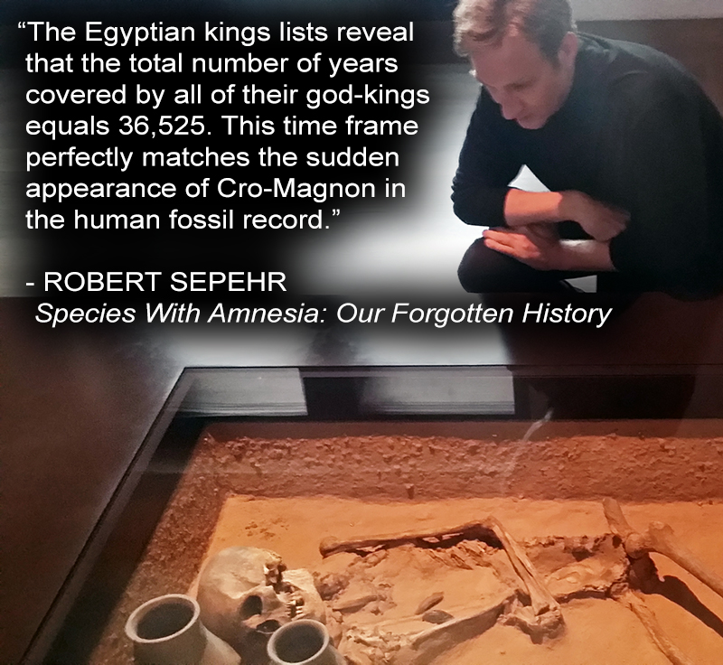 According to anthropologist Robert Sepehr, “the Egyptian kings lists reveal that the total number of years covered by all of their god-kings equals 36,525. This time frame perfectly matches the sudden appearance of Cro-Magnon in the human fossil record.”