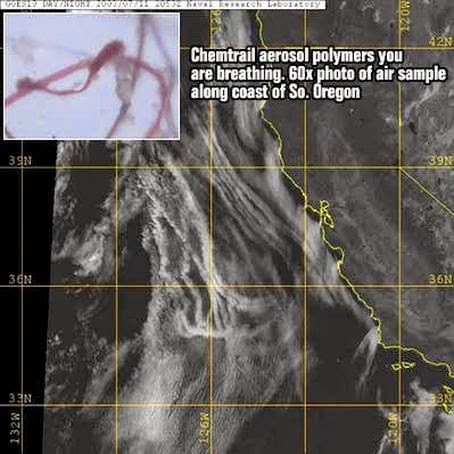 LIFE IN THE TIME OF CHEMTRAILS 1997-2012: YOU ARE NOW BREATHING ETHYLENE DIBROMIDE, VIRALLY MUTATED MOLDS, NANO-PARTICULATES OF ALUMINUM AND BARIUM AND CATIONIC POLYMER FIBERS WITH UNIDENTIFIED BIO-ACTIVE MATERIAL: “We the people have not been warned, advised or consulted but are certainly vulnerable to the outcomes.” Lightwatcher.com “Biologic components have been reported in airborne samples that include: modified molds,