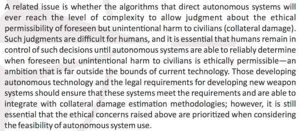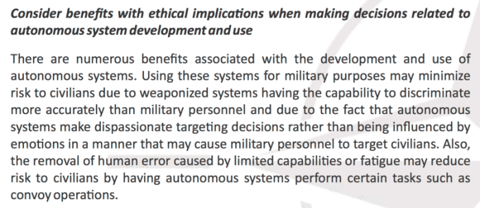 Yet the NATO document does not stop there. It even goes so far as to argue that policymakers considering the development of autonomous weapon systems for lethal combat should reflect on the possibility that delegating target and kill decisions to machine agents would minimize civilian casualties.