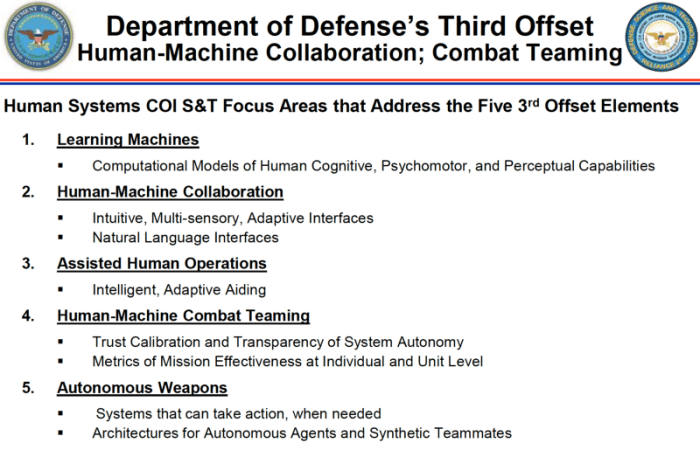 A separate Pentagon document dated March 2016 — a set of presentation slides for that month’s IEEE Conference on Cognitive Methods in Situation Awareness & Decision Support — insists that DoD policy is to ensure that autonomous systems ultimately operate under human supervision: