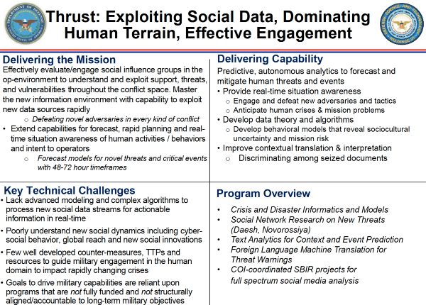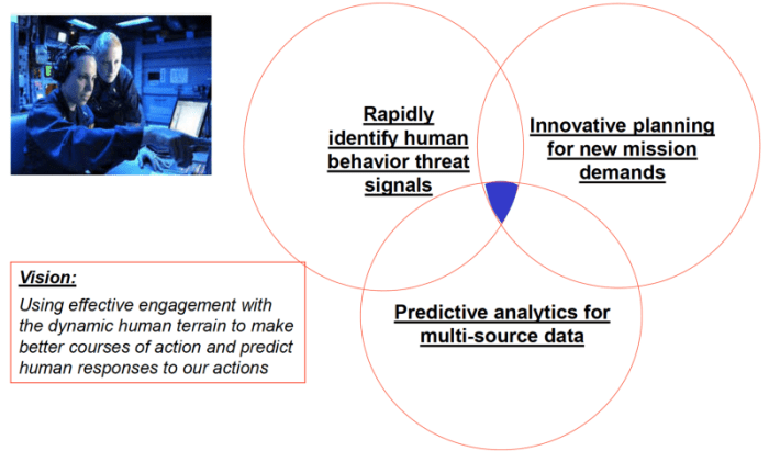 This means not just developing “behavioral models that reveal sociocultural uncertainty and mission risk”, but creating “forecast models for novel threats and critical events with 48–72 hour timeframes”, and even establishing technology that will use such data to “provide real-time situation awareness.”