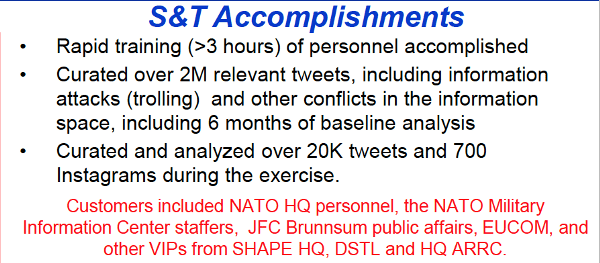 During the exercise, Trident Juncture — NATO’s largest exercise in a decade — US military personnel “curated over 2M [million] relevant tweets, including information attacks (trolling) and other conflicts in the information space, including 6 months of baseline analysis.” They also “curated and analyzed over 20K [i.e. 20,000] tweets and 700 Instagrams during the exercise.”