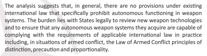 The NATO document, which aims to provide expert legal advice to government policymakers, sets out a position in which the deployment of autonomous weapon systems for lethal combat — in particular the delegation of targeting and kill decisions to machine agents — is viewed as being perfectly legitimate in principle.
