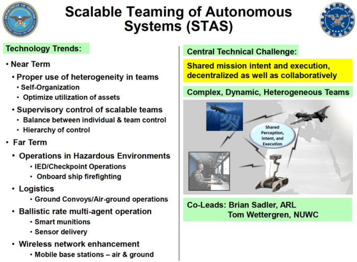 This will be the foundation for two types of weapon systems: “Human/ Autonomous System Interaction and Collaboration (HASIC)” and “Scalable Teaming of Autonomous Systems (STAS).”