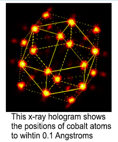 To encode light means to invite photons to occupy space and transform themselves into elementary particles and atoms, organizing themselves like an orchestra with a specific piece to perform as a group. The operative term is to invite, for that is precisely what we do. Where and how they organize themselves is according to the pattern of the information (or thought) template, as in the figure to the right. The X-ray hologram shows the positions of each of cobalt atoms within a structure primed by a thought or information template.