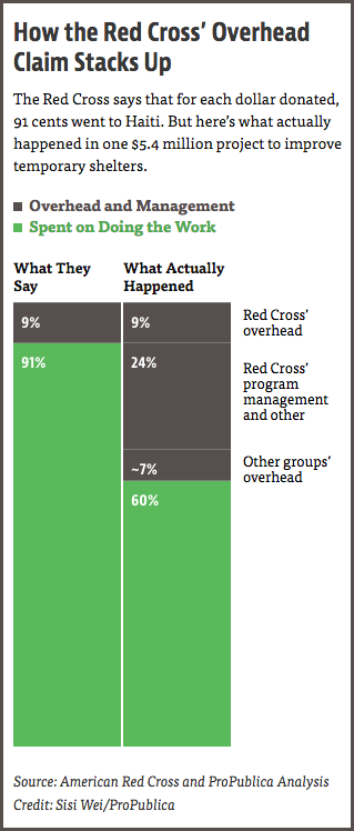 But the reality is that less money went to Haiti than 91 percent. That’s because in addition to the Red Cross’ 9 percent overhead, the other groups that got grants from the Red Cross also have their own overhead.