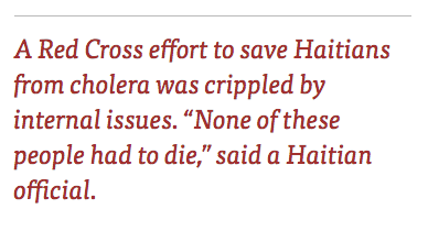 When a cholera epidemic raged through Haiti nine months after the quake, the biggest part of the Red Cross’ response — a plan to distribute soap and oral rehydration salts — was crippled by “internal issues that go unaddressed,” wrote the director of the Haiti program in her May 2011 memo.