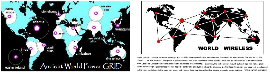 I’m one of few people who understand Tesla’s historical significance, which came from a powerful realization that the scientific work of this Superman EXPLAINS ANCIENT MYSTERIES and PYRAMIDS and the Atlantean World Grid. It changes all of History! This goes back to the ‘70s and my strange marriage to a very psychic woman. In 1974, she channeled 13 points on a globe (map still with me only a few feet away as I write this) and in a trance state, said this was ATLANTIS: main Power Station on a large continent in the Bermuda Triangle area and 12 smaller sub-stations that formed a world grid. I certainly did not understand the principle involved with this ‘power’ back then. Most importantly, 4 of the points on the globe were completely unknown to the best investigators in 1974 (Russian site in Sayan Mts., Yonaguni, ruins in Brazil’s Amazon & Canadian Indian Image in Badlands). Other sites, in a Grid of 13, were immediately recognized such as Great Pyramid, Incas, Stonehenge, Easter Island, while lesser known ones were found with some study (Tassili, Zimbabwe, New Delhi Pillar, Alice Springs, AUS). These were the Cradles of Civilization; we originated from these 13 sites at the exact same time! (Reason for unlucky 13?) The Ancient Power Grid was Atlantis and Atlantis was a super high-tech Eden or World Metropolis~