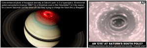 Another interesting oddity out of millions throughout our Solar System…What the hell are spinning on Saturn’s North and South Poles? Check out the astonishing photos: CBS 1-EYE at the South Pole and a 6-sided (Time) Vortex at the North Pole? Maybe there are bits of truth in the movie “Interstellar”?