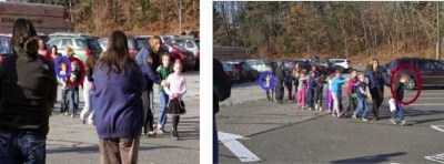 It’s bad enough that we have a series of parents looking on, some with their arms cross or their hands in their pockets–which is certainly not what we would expect in an emergency situation. It gets much worse when you realize that the police woman has stopped the children to rearrange them to get “a better shot”! Here’s a comparison that shows what was going on and demonstrates–as conclusively as anyone could have the right to expect–that the first photograph was staged to create the false impression that there was an emergency and that these kids needed to be removed from a threat at the earliest possible opportunity–which would not leave time to stop and rearrange them as follows: