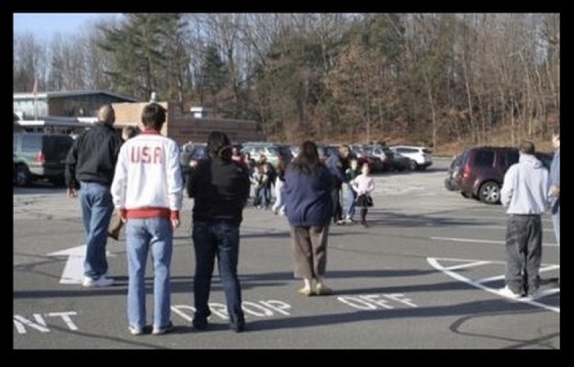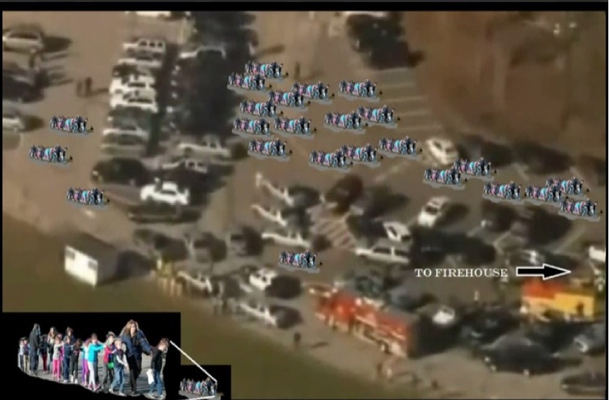 Inspection of the vehicles in the parking lot in front of the school shows that they are parked in the wrong direction (which should have been nose-in), given the arrangement for driving into the lot. The image itself suggests of a group of drivers methodically filling up the lot with used or abandoned cars, driving straight into the designated parking places without regard for how they should have been arranged. Once again we ask, “What is the probability that the lot would be filled with cars parked in the wrong direction, if this had been a real event? What if this had been a drill?” Truly stunning, however, is the discovery of a series of photographs that display setting the stage early in the morning for the events that would transpire this day, including this one from Chapter 8: