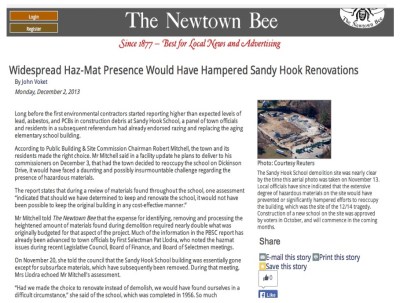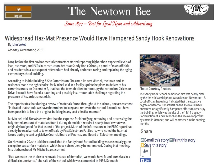 Other pay-offs, bribes and hush-money–and under the circumstances, is there something more appropriate to call it?–are documented in Chapter 5. When debate was taking place over the choice between refurbishing the old school or constructing a new one, The Newtown Bee published about the presence of asbestos, lead and PCBs in the building, which had no doubt factored in the earlier decision to abandon the school in 2008. Newtown received $50,000,000 to build a brand new K-4 elementary school. I surveyed the cost of comparable cost for K-4 schools across the nation and discovered they average $7,000,000, which reflects the generous benefits that a community might accrue from cooperating covertly with the federal government in the pursuit of its political agenda.