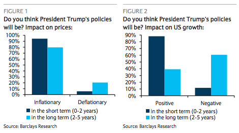 Investors are, however, more sceptical with regards to the longer-term effect of Trump’s policies. While more than 80% of investors expect policies to be inflationary over the next five years, the positive boost to growth is expected to be short lived. The majority of investors fear that the growth outlook will be negative beyond the two-year time frame.