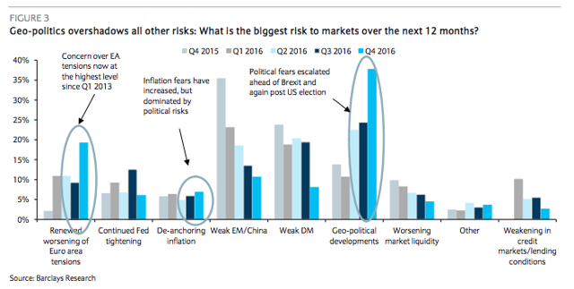 Further, investors agree with my contention that geopolitics is by far the biggest risk to markets over the next 12 months. They also expressed deep consternation about elections in France and Germany, something I also discussed earlier today in the piece cited above. Here’s Barclays: