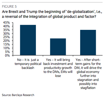 Additionally, 60% of those surveyed said Brexit and Trump’s election have likely started us down the road to deglobalization – something else I’ve expressed quite a bit of concern over:
