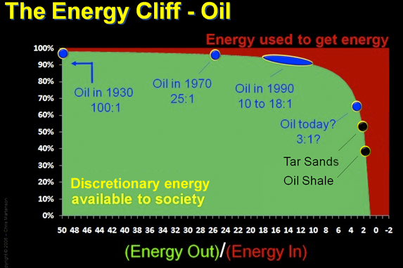 So, perhaps you should just relax and go with the flow. After all, being a slave in the service of the technosphere is not immediately life-threatening… unless you crash into a tree or get run over by a drunk. But there is another problem: this arrangement isn’t going to last. The net energy that can be extracted out of a barrel of oil is quickly shrinking. In less then a decade the energy surplus required to maintain a car-centric lifestyle will no longer exist. If private car ownership and daily driving are required of you in order to survive, then you won’t survive. There goes at least 18% of the world’s population, which will find itself stranded in the middle of an impassable landscape. Oops!