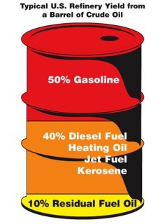 It turns out that the fact that so many people are forced to own a car has nothing to do with transportation and everything to do with petroleum chemistry. About half of what can be usefully extracted from a barrel of crude oil is in the form of gasoline. It is possible to boost the fraction of other, more useful products, such as kerosene, diesel fuel, jet fuel and heating oil, but not by much and at a cost of reduced net energy. But gasoline is not very useful at all. It is volatile (quite a lot of it evaporates, especially in the summer); it is chemically unstable and doesn’t keep for long; it is toxic and carcinogenic. It has a rather low flash point, limiting the compression ratio that can be achieved by gasoline-fueled engines, making them thermodynamically less efficient. It is useless for large engines, and is basically a small-engine fuel. Gasoline-powered engines don’t last very long because gasoline-air mixture is detonated (using an electric spark) rather than burned, and the shock waves from the detonations cause components to wear out quickly. They have few industrial uses; all of the serious transportation infrastructure, including locomotives, ships, jet aircraft, tractor-trailers, construction equipment and electrical generators run on petroleum distillates such as kerosene, jet fuel, diesel oil and bunker fuel.