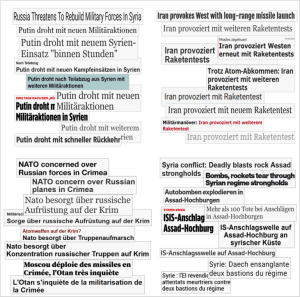“Putin threatens”, “Iran provokes”, “NATO concerned”, “Assad stronghold”: Similarities in content and wording due to reports by global news agencies.
