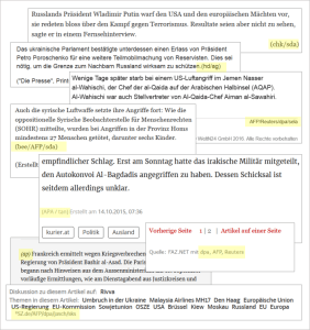The following figure shows some examples of such citation based on the Syria coverage of the largest daily newspaper in Switzerland, Tages-Anzeiger. The articles are all from the first days of October 2015, when Russia for the first time intervened directly in the Syrian war (US/UK sources are highlighted):