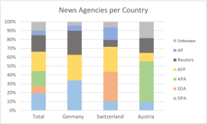 The following Figure 3 shows the breakdown of agency stories (by agency abbreviation) for each news agency, in total and per country. The 211 agency reports carried a total of 277 agency codes (a story may consist of material from more than one agency). In total, 24% of agency reports came from the AFP; about 20% each by the DPA, APA and Reuters; 9% of the SDA; 6% of the AP; and 11% were unknown (no labeling or blanket term “agencies”).