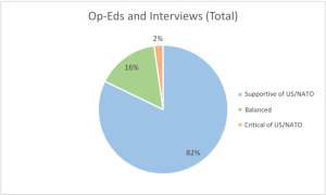 In the next step, central statements were used to rate the orientation of editorial opinions (28), guest comments (10) and interview partners (7) (a total of 45 articles). As Figure 4 shows, 82% of the contributions were generally US/NATO friendly, 16% neutral or balanced, and 2% predominantly US/NATO critical.