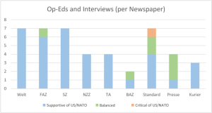The following Figure 5 shows the orientation of the contributions, guest comments and interviewees, in turn broken down by individual newspapers. As can be seen, Welt, Süddeutsche Zeitung, NZZ, Zürcher Tagesanzeiger and the Austrian newspaper Kurier presented exclusively US/NATO-friendly opinion and guest contributions; this goes for FAZ too, with the exception of one neutral/balanced contribution. The Standard brought four US/NATO friendly, three balanced/neutral, as well as the already mentioned US/NATO critical opinion contributions.