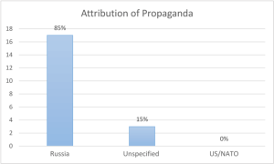 It should be noted that about half of the cases (nine) were in the Swiss NZZ, which spoke of Russian propaganda quite frequently (“Kremlin propaganda”, “Moscow propaganda machine”, “propaganda stories”, “Russian propaganda apparatus” etc.), followed by German FAZ (three), Welt and Süddeutsche Zeitung (two each) and the Austrian newspaper Kurier (one). The other newspapers did not mention propaganda, or only in a neutral context (or in the context of IS).