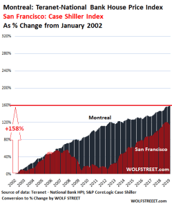 Vancouver house prices soared 316% since January 2002 through the peak (July 2018); San Francisco Bay Area house prices soared 121% through the peak (November 2018). And what we get is a chart that shows how the majestically splendid housing bubble in Vancouver (black) totally crushes, annihilates, and ridicules the crazy insane mind-blowing house price increases in San Francisco (red):