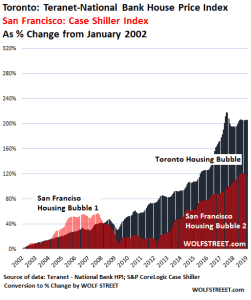 I converted this Toronto index to “percent-change since January 2002” and compared it to the crazy insane mind-blowing housing bubble in the San Francisco Bay Area. And Toronto just blows away the Bay Area for another holy-cow moment: