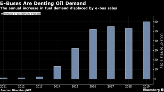 By the end of this year, a cumulative 270,000 barrels a day of diesel demand will have been displaced by electric buses, most of it in China, according to a report published Tuesday by BloombergNEF. That’s more than three times the displacement by all the world’s passenger electric vehicles (a market where Tesla has a share of about 12 percent.).