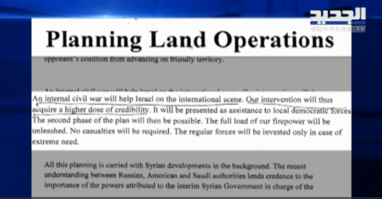Although the source of the document is Israeli and created in partnership with Washington, no one knows who presented it to Aoun. The Lebanese TV station, Al-Jadeed, initially reported the document on Lebanese TV and a video on its website. Geopolitics Alert translated the report for this article.