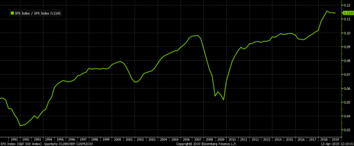This is a 30-year chart of total S&P 500 earnings divided by total S&P 500 sales. It’s how many pennies of earnings S&P 500 companies get from a dollar of sales … earnings margin, essentially, at a high level of aggregation. So at the lows of 1991, $1 in sales generated a bit more than $0.03 in earnings for the S&P 500. Today in 2019, we are at an all-time high of a bit more than $0.11 in earnings from $1 in sales.