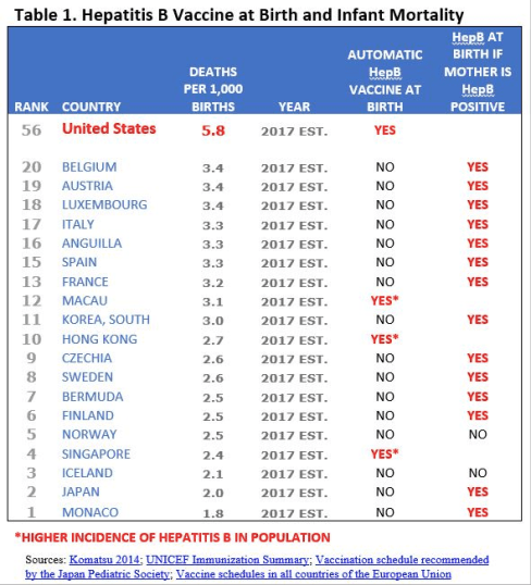 Among the 20 countries with the world’s best infant mortality outcomes, only three countries (Hong Kong, Macau and Singapore) automatically administer the HepB vaccine to all newborns—governed by the rationale that hepatitis B infection is highly endemic in these countries. Most of the other 17 top-ranking countries—including Japan—give the HepB vaccine at birth only if the mother is hepatitis B positive (Table 1). The U.S., with its disgraceful #56 infant mortality ranking, gives the HepB vaccine to all four million babies born annually despite a low incidence of hepatitis B.