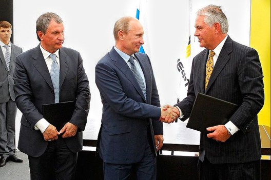 President Vladimir Putin; Igor Sechin, Chairman of the Board of Rosneft (left); and Rex Tillerson, Chairman of ExxonMobil signed an agreement on joint development of petroleum reserves in Western Siberia, June 2012. Photo credit: President of Russia / Wikimedia (CC BY 3.0)