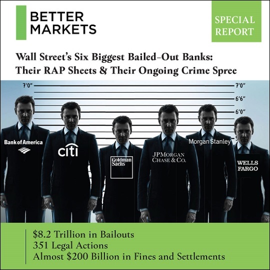 One day before Democrats on the House Financial Services Committee held an historic grilling of the CEOs of the mega banks on Wall Street, the nonprofit watchdog, Better Markets, released an in-depth research report on “Wall Street’s Six Biggest Bailed-Out Banks: Their RAP Sheets & Their Ongoing Crime Spree.” The report detailed facts, figures and this inescapable conclusion: