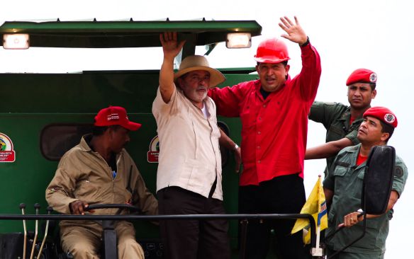 Hugo Chavez and Luiz Inacio Lula da Silva visit a soy farm in El Tigre in Venezuela’s Anzoategui state, Oct. 30, 2009. Ariana Cubillos | AP