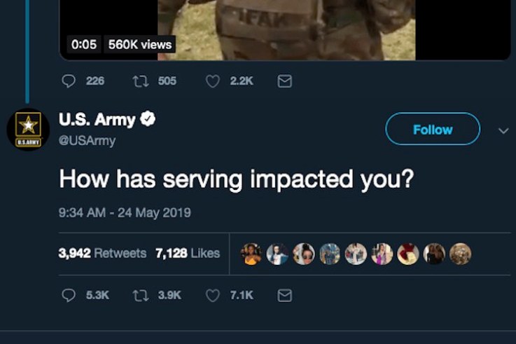 After posting a video of a young recruit talking to the camera about how service allows him to better himself “as a man and a warrior”, the US Army tweeted, “How has serving impacted you?”