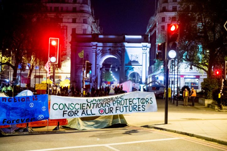 Night time road blocks at the Extinction Rebellion environmental activists camp at Marble Arch © Photo by Ollie Millington/Getty Images