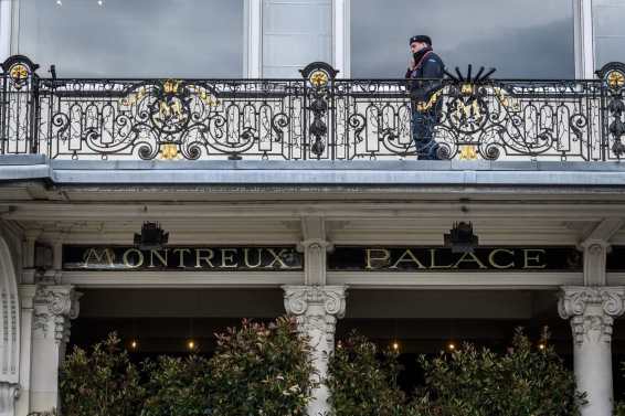 A security guard is seen May 29 above the entrance of the Fairmont Le Montreux Palace hotel in the Swiss town of Montreux, which is set to host the annual Bilderberg Meeting.