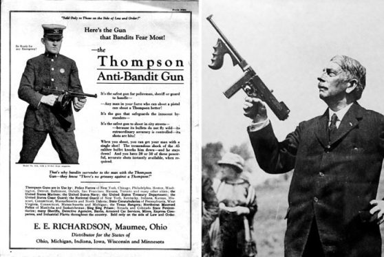 Front cover of a brochure selling Thompsons in the 1920s (left). General John Taliaferro Thompson holding the Thompson submachine gun in 1921 (right). Photo credit: Unknown / Wikimedia and Jamie C / Wikimedia (CC BY 2.0)