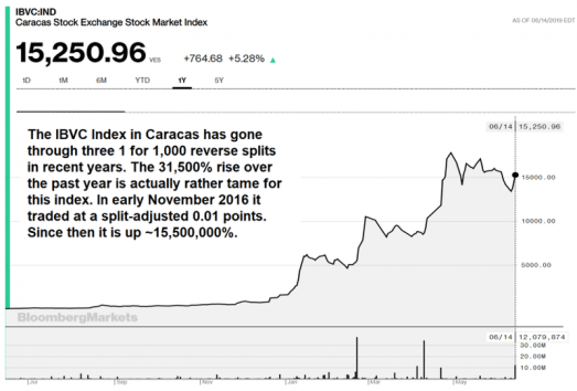 Venezuela’s hyperinflation-driven stock market. Note: adjusted for the three 1 for 1,000 reverse splits of the index since early 2014, its 21st century low (established in 2002) was 0.000008 points. [PT]