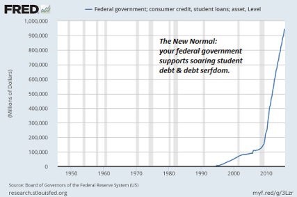 If you think this chart of soaring student loan debt is a sign of “success,” you are 1) delusional 2) protected from the dire consequences of this failure 3) getting your paycheck from this failed system. That in a nutshell is the state of the nation: those who are protected from the consequences of failure are loyal to the Establishment, as are the millions drawing a paycheck from systems they know are irredeemable failures.