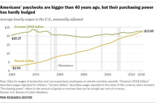 Bottom line: how much housing, higher education and well-being does the average wage buy now compared to decades past? Not much. The statistics are bleak: wages are basically unchanged from the high water mark 50 years ago, which coincidentally was also the high water mark of U.S. energy production until very recently. Adjusted for purchasing power and quality, the average paycheck buys far less than it did 50 years ago.